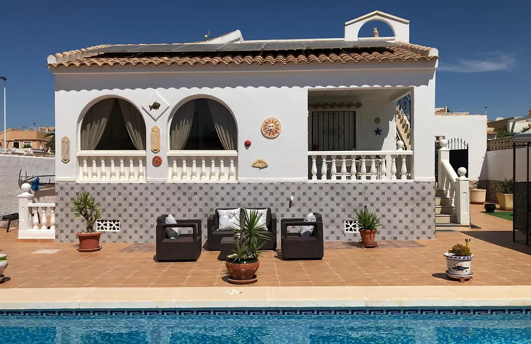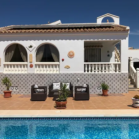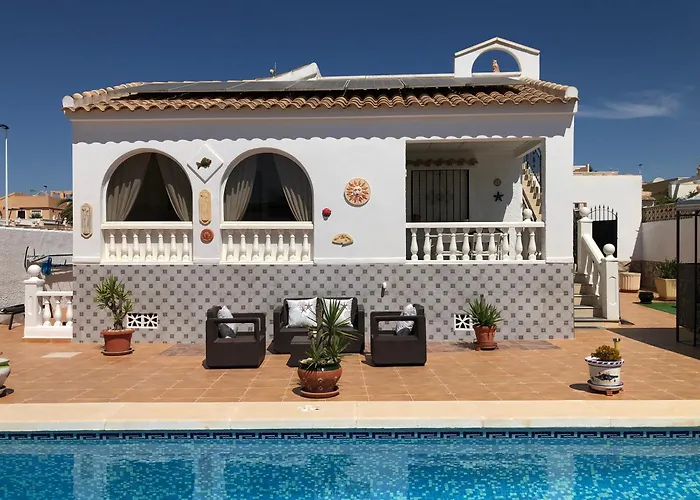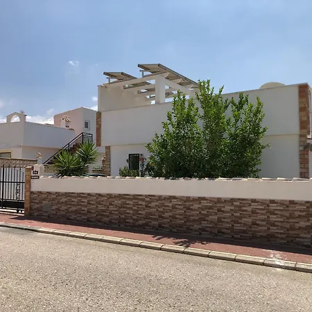 De 2-slaapkamer Villa Rosa El Pozo del Cabo verwacht gasten op een terras met een eettafel.
